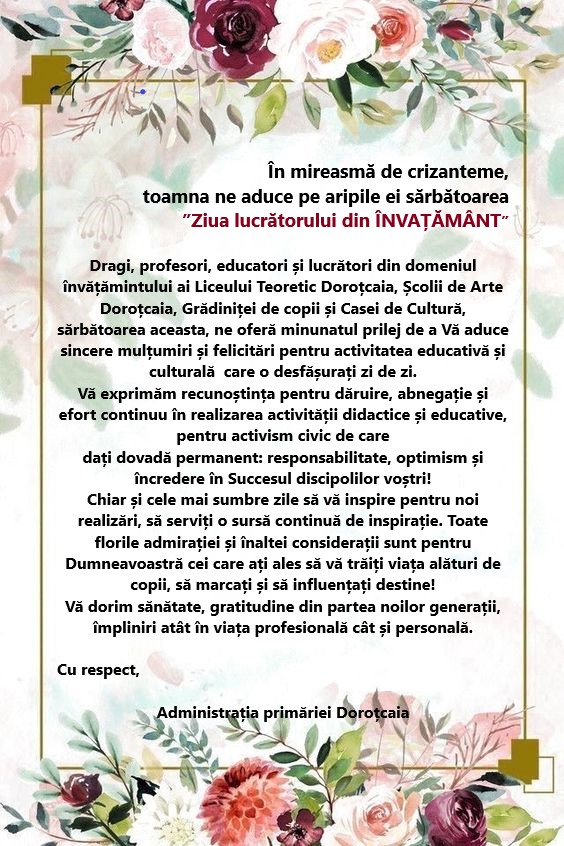 Vă salut pe pagina noastră oficială a primăriei s. Doroţcaia. Aceasta este cartea de vizită virtuală a satului nostru, care sper că vă va provoca curiozitate şi dorinţa de a vă informa cu activitatea autorităţilor publice locale. Ţin să vă mulţumesc că aţi ales această cale de comunicare, care este una din modalităţile prin care primăria s. Doroţcaia va fi mai aproape de locuitorii satului cît şi de oaspeţii săi.