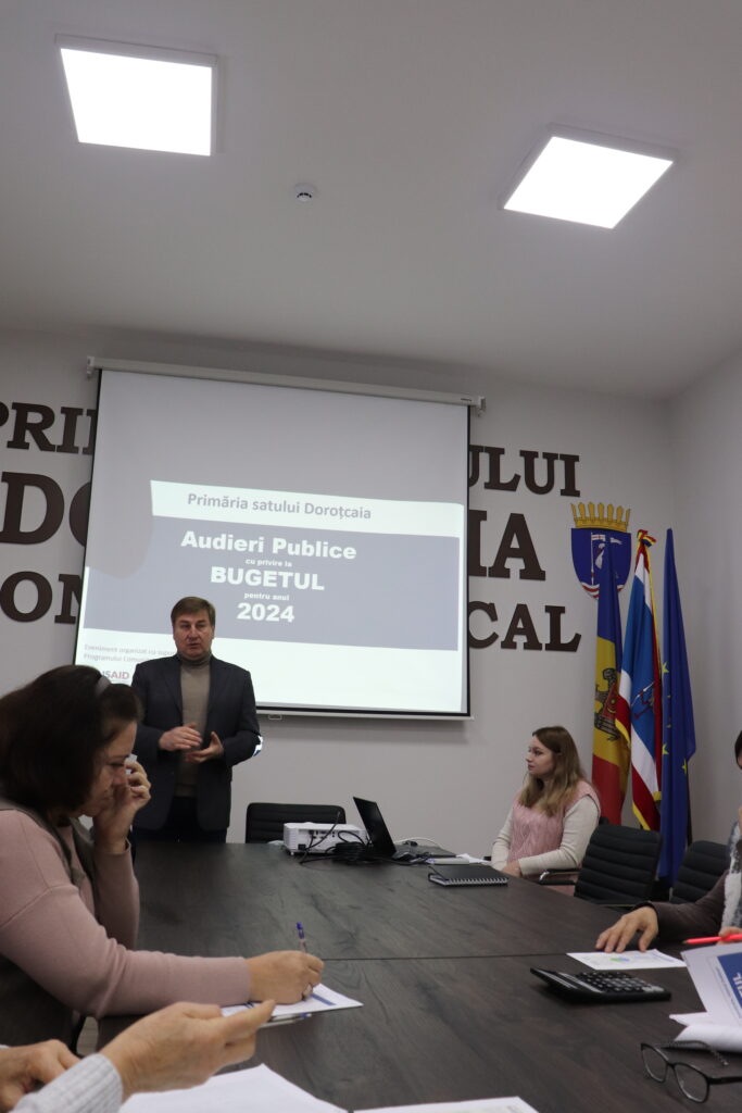 Astăzi, 23 noiembrie, în incinta sălii de ședințe a primăriei s. Doroțcaia, a avut loc prezentarea proiectul bugetului pentru anul 2024 al primăriei Doroțcaia. Evenimentul a fost organizat cu suportul Programului Comunitatea Mea, finanțat de USAID și implimentat de IREX Moldova. Pe ordinea de zi au fost următoarele chestiuni: