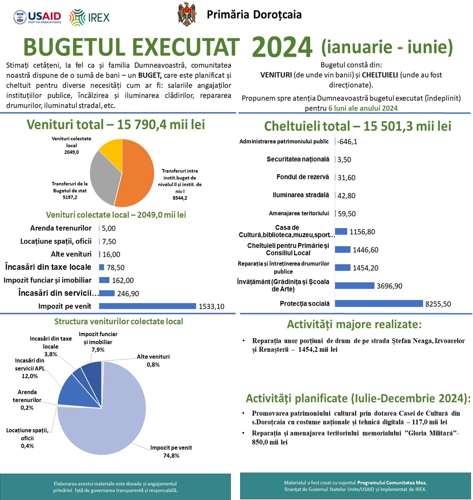 În conformitate cu Legea 436/2006 privind Administrația publică locală și în scopul respectării prevederilor Legii privind transparenţa decizională nr.239/2008 se propune spre consultare infograficul privind executarea bugetului local pentru primul sem. a anului 2024, la partea de venitrui și cheltuieli.Totodată transmitem mulțumiri programului USAID Moldova, Programul Comunitatea Mea, IREX în Moldova.